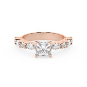 50% הנחהטבעת אירוסין סוליטר ויהלומים בצדדים דגם 50019 זהב אדום רוזגולד 14 קראט במרכז אבן מעבדה מוסונייט 0.75 קראט בחיתוך פרינסס עם תעודה גמולוגית מסביב ובצדדים אבני מעבדה מוסונייט במשקל כולל של 0.28 קראט בחיתוך עגול