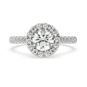 50% הנחהטבעת אירוסין היילו דגם 50024 כסף מצופה זהב לבן במרכז יהלום מעבדה 0.75 קראט בחיתוך עגול עם תעודה גמולוגית מסביב ובצדדים יהלומי מעבדה במשקל כולל של 0.39 קראט בחיתוך עגול