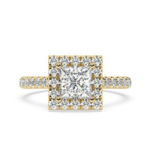 50% הנחהטבעת אירוסין היילו דגם 50026 כסף מצופה זהב צהוב במרכז יהלום מעבדה 0.50 קראט בחיתוך פרינסס עם תעודה גמולוגית מסביב ובצדדים יהלומי מעבדה במשקל כולל של 0.54 קראט בחיתוך עגול