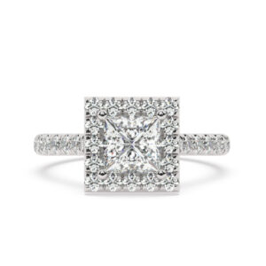 50% הנחהטבעת אירוסין היילו דגם 50026 כסף מצופה זהב לבן במרכז יהלום מעבדה 0.50 קראט בחיתוך פרינסס עם תעודה גמולוגית מסביב ובצדדים יהלומי מעבדה במשקל כולל של 0.54 קראט בחיתוך עגול