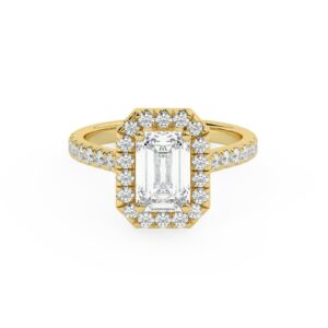 50% הנחהטבעת אירוסין היילו דגם 50026 כסף מצופה זהב צהוב במרכז יהלום מעבדה 0.50 קראט בחיתוך אמרלד עם תעודה גמולוגית מסביב ובצדדים יהלומי מעבדה במשקל כולל של 0.54 קראט בחיתוך עגול