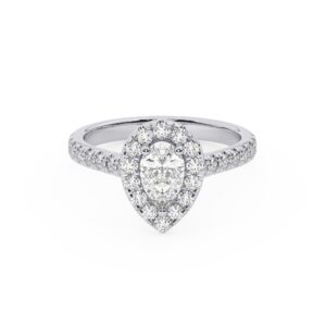50% הנחהטבעת אירוסין היילו דגם 50026 כסף מצופה זהב לבן במרכז יהלום מעבדה 0.50 קראט בחיתוך טיפה עם תעודה גמולוגית מסביב ובצדדים יהלומי מעבדה במשקל כולל של 0.54 קראט בחיתוך עגול