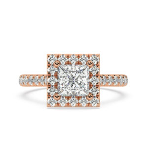 50% הנחהטבעת אירוסין היילו דגם 50026 כסף מצופה זהב אדום רוזגולד במרכז יהלום מעבדה 0.50 קראט בחיתוך פרינסס עם תעודה גמולוגית מסביב ובצדדים יהלומי מעבדה במשקל כולל של 0.54 קראט בחיתוך עגול