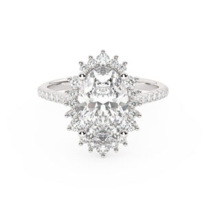 50% הנחהטבעת אירוסין היילו דגם 50026 כסף מצופה זהב לבן במרכז יהלום מעבדה 1 קראט בחיתוך אובל עם תעודה גמולוגית אירופאית IGI מסביב ובצדדים יהלומי מעבדה במשקל כולל של 0.60 קראט בחיתוך עגול
