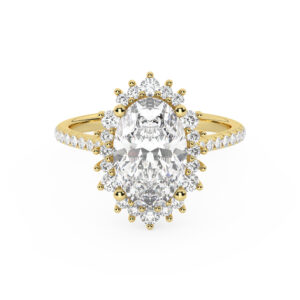 50% הנחהטבעת אירוסין היילו דגם 50026 כסף מצופה זהב צהוב במרכז יהלום מעבדה 1 קראט בחיתוך אובל עם תעודה גמולוגית אירופאית IGI מסביב ובצדדים יהלומי מעבדה במשקל כולל של 0.60 קראט בחיתוך עגול