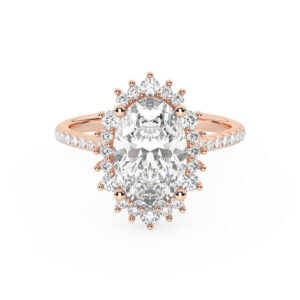 50% הנחהטבעת אירוסין היילו דגם 50026 כסף מצופה זהב אדום רוזגולד במרכז יהלום מעבדה 1 קראט בחיתוך אובל עם תעודה גמולוגית אירופאית IGI מסביב ובצדדים יהלומי מעבדה במשקל כולל של 0.60 קראט בחיתוך עגול