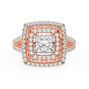 50% הנחהטבעת אירוסין היילו דגם 50025 כסף מצופה זהב אדום רוזגולד במרכז אבן מעבדה מוסונייט 0.50 קראט בחיתוך פרינסס עם תעודה גמולוגית מסביב ובצדדים אבני מעבדה מוסונייט במשקל כולל של 0.62 קראט בחיתוך עגול