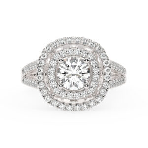 50% הנחהטבעת אירוסין היילו דגם 50025 כסף מצופה זהב לבן במרכז אבן מעבדה מוסונייט 0.75 קראט בחיתוך עגול עם תעודה גמולוגית מסביב ובצדדים אבני מעבדה מוסונייט במשקל כולל של 0.62 קראט בחיתוך עגול