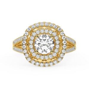 50% הנחהטבעת אירוסין היילו דגם 50025 כסף מצופה זהב צהוב במרכז אבן מעבדה מוסונייט 0.50 קראט בחיתוך עגול עם תעודה גמולוגית מסביב ובצדדים אבני מעבדה מוסונייט במשקל כולל של 0.62 קראט בחיתוך עגול