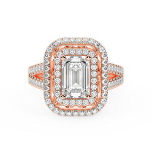 50% הנחהטבעת אירוסין היילו דגם 50025 כסף מצופה זהב אדום רוזגולד במרכז אבן מעבדה מוסונייט 0.50 קראט בחיתוך אמרלד עם תעודה גמולוגית מסביב ובצדדים אבני מעבדה מוסונייט במשקל כולל של 0.62 קראט בחיתוך עגול