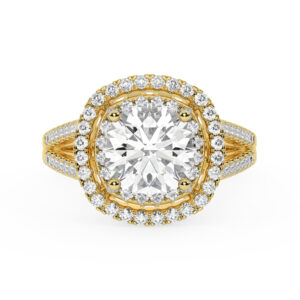50% הנחהטבעת אירוסין היילו דגם 50025 כסף מצופה זהב צהוב במרכז אבן מעבדה מוסונייט 0.75 קראט בחיתוך עגול עם תעודה גמולוגית מסביב ובצדדים אבני מעבדה מוסונייט במשקל כולל של 0.62 קראט בחיתוך עגול