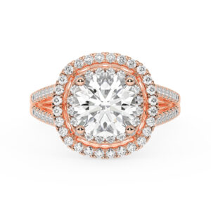 50% הנחהטבעת אירוסין היילו דגם 50025 כסף מצופה זהב אדום רוזגולד במרכז אבן מעבדה מוסונייט 0.75 קראט בחיתוך עגול עם תעודה גמולוגית מסביב ובצדדים אבני מעבדה מוסונייט במשקל כולל של 0.62 קראט בחיתוך עגול