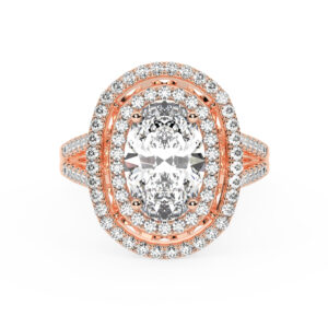 50% הנחהטבעת אירוסין היילו דגם 50025 כסף מצופה זהב אדום רוזגולד במרכז אבן מעבדה מוסונייט 0.75 קראט בחיתוך אובל עם תעודה גמולוגית מסביב ובצדדים אבני מעבדה מוסונייט במשקל כולל של 0.62 קראט בחיתוך עגול