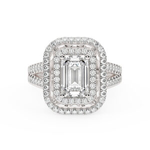 50% הנחהטבעת אירוסין היילו דגם 50025 כסף מצופה זהב לבן במרכז אבן מעבדה מוסונייט 0.75 קראט בחיתוך אמרלד עם תעודה גמולוגית מסביב ובצדדים אבני מעבדה מוסונייט במשקל כולל של 0.62 קראט בחיתוך עגול