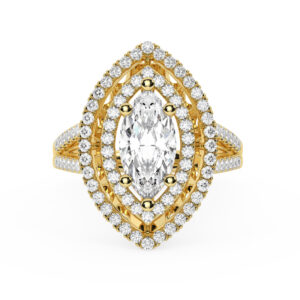 50% הנחהטבעת אירוסין היילו דגם 50025 כסף מצופה זהב צהוב במרכז אבן מעבדה מוסונייט 0.75 קראט בחיתוך מרקיזה עם תעודה גמולוגית מסביב ובצדדים אבני מעבדה מוסונייט במשקל כולל של 0.62 קראט בחיתוך עגול