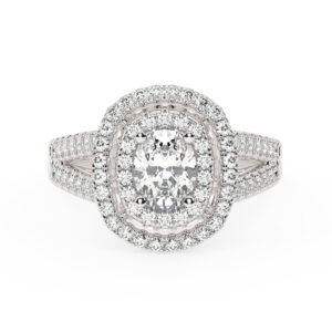 50% הנחהטבעת אירוסין היילו דגם 50025 כסף מצופה זהב לבן במרכז אבן מעבדה מוסונייט 0.75 קראט בחיתוך אובל עם תעודה גמולוגית מסביב ובצדדים אבני מעבדה מוסונייט במשקל כולל של 0.62 קראט בחיתוך עגול