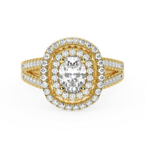 50% הנחהטבעת אירוסין היילו דגם 50025 כסף מצופה זהב צהוב במרכז אבן מעבדה מוסונייט 0.75 קראט בחיתוך אובל עם תעודה גמולוגית מסביב ובצדדים אבני מעבדה מוסונייט במשקל כולל של 0.62 קראט בחיתוך עגול