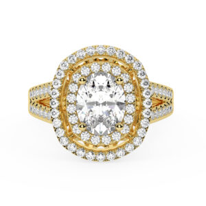 50% הנחהטבעת אירוסין היילו דגם 50025 כסף מצופה זהב צהוב במרכז אבן מעבדה מוסונייט 2 קראט בחיתוך אובל עם תעודה גמולוגית בינלאומית GRA מסביב ובצדדים אבני מעבדה מוסונייט במשקל כולל של 0.62 קראט בחיתוך עגול