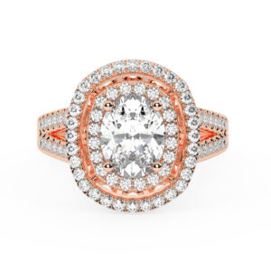50% הנחהטבעת אירוסין היילו דגם 50024 כסף מצופה זהב אדום רוזגולד במרכז יהלום מעבדה 2 קראט בחיתוך אובל עם תעודה גמולוגית אירופאית IGI מסביב ובצדדים יהלומי מעבדה במשקל כולל של 0.56 קראט בחיתוך עגול