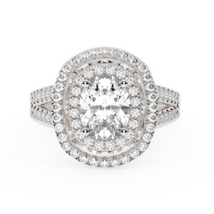 50% הנחהטבעת אירוסין היילו דגם 50025 כסף מצופה זהב לבן במרכז אבן מעבדה מוסונייט 2.50 קראט בחיתוך אובל עם תעודה גמולוגית בינלאומית GRA מסביב ובצדדים אבני מעבדה מוסונייט במשקל כולל של 0.62 קראט בחיתוך עגול