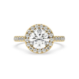50% הנחהטבעת אירוסין היילו דגם 50024 כסף מצופה זהב צהוב במרכז אבן מעבדה מוסונייט 2.50 קראט בחיתוך עגול עם תעודה גמולוגית בינלאומית GRA מסביב ובצדדים אבני מעבדה מוסונייט במשקל כולל של 0.39 קראט בחיתוך עגול
