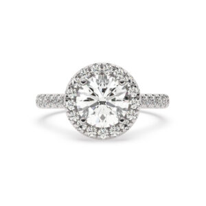 50% הנחהטבעת אירוסין היילו דגם 50024 כסף מצופה זהב לבן במרכז אבן מעבדה מוסונייט 2.50 קראט בחיתוך עגול עם תעודה גמולוגית בינלאומית GRA מסביב ובצדדים אבני מעבדה מוסונייט במשקל כולל של 0.39 קראט בחיתוך עגול