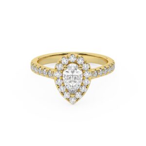 50% הנחהטבעת אירוסין היילו דגם 50026 כסף מצופה זהב צהוב במרכז אבן מעבדה מוסונייט 0.50 קראט בחיתוך טיפה עם תעודה גמולוגית מסביב ובצדדים אבני מעבדה מוסונייט במשקל כולל של 0.54 קראט בחיתוך עגול