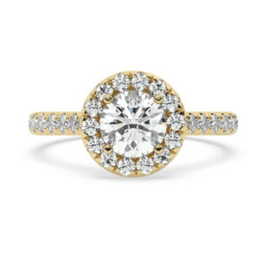 50% הנחהטבעת אירוסין היילו דגם 50026 כסף מצופה זהב צהוב במרכז אבן מעבדה מוסונייט 0.50 קראט בחיתוך עגול עם תעודה גמולוגית מסביב ובצדדים אבני מעבדה מוסונייט במשקל כולל של 0.54 קראט בחיתוך עגול