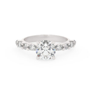 50% הנחהטבעת אירוסין סוליטר ויהלומים בצדדים דגם 50014 כסף מצופה זהב לבן במרכז יהלום מעבדה 1.50 קראט בחיתוך עגול עם תעודה גמולוגית אירופאית IGI מסביב ובצדדים יהלומי מעבדה במשקל כולל של 0.50 קראט בחיתוך עגול