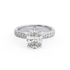 טבעת אירוסין סוליטר ומוסונייט בצדדים דגם 50017 כסף מצופה זהב לבן במרכז אבן מעבדה מוסונייט 2.50 קראט בחיתוך אובל עם תעודה גמולוגית בינלאומית GRA מסביב ובצדדים אבני מעבדה מוסונייט במשקל כולל של 0.15 קראט בחיתוך עגול