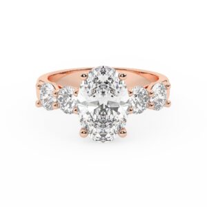 טבעת אירוסין סוליטר ויהלומים בצדדים דגם 50037 כסף מצופה זהב אדום רוזגולד במרכז יהלום מעבדה 0.75 קראט בחיתוך אובל עם תעודה גמולוגית מסביב ובצדדים יהלומי מעבדה במשקל כולל של 0.32 קראט בחיתוך עגול