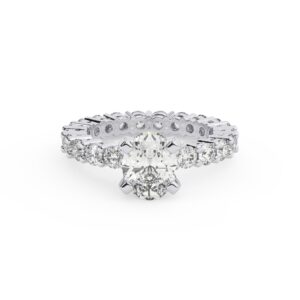 טבעת אירוסין סוליטר וזירקונים בצדדים איטרנטיני דגם 50044 כסף מצופה זהב לבן במרכז זירקוניה 2.50 קראט בחיתוך אובל מסביב ובצדדים זירקונים בחיתוך עגול