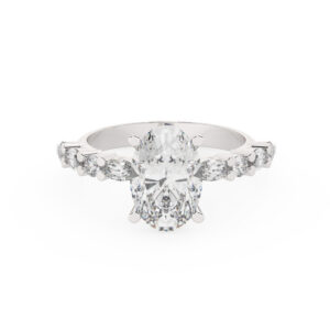 50% הנחהטבעת אירוסין סוליטר ויהלומים בצדדים דגם 50014 כסף מצופה זהב לבן במרכז יהלום מעבדה 0.50 קראט בחיתוך אובל עם תעודה גמולוגית מסביב ובצדדים יהלומי מעבדה במשקל כולל של 0.50 קראט בחיתוך עגול