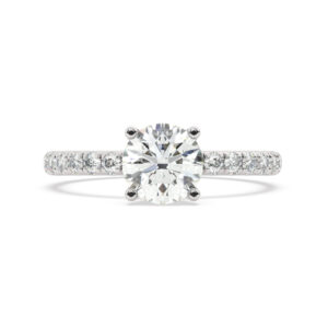50% הנחהטבעת אירוסין סוליטר ויהלומים בצדדים דגם 50037 כסף מצופה זהב לבן במרכז יהלום מעבדה 1.50 קראט בחיתוך עגול עם תעודה גמולוגית אירופאית IGI מסביב ובצדדים יהלומי מעבדה במשקל כולל של 0.32 קראט בחיתוך עגול