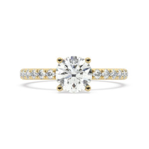 50% הנחהטבעת אירוסין סוליטר ויהלומים בצדדים דגם 50037 כסף מצופה זהב צהוב במרכז יהלום מעבדה 1.50 קראט בחיתוך עגול עם תעודה גמולוגית אירופאית IGI מסביב ובצדדים יהלומי מעבדה במשקל כולל של 0.32 קראט בחיתוך עגול