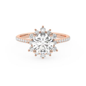 50% הנחהטבעת אירוסין היילו דגם 50024 זהב אדום רוזגולד 14 קראט במרכז זירקוניה 2 קראט בחיתוך עגול מסביב ובצדדים זירקונים בחיתוך עגול