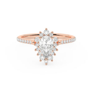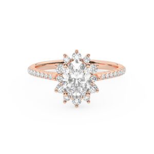 50% הנחהטבעת אירוסין היילו דגם 50024 זהב אדום רוזגולד 14 קראט במרכז זירקוניה 2 קראט בחיתוך טיפה מסביב ובצדדים זירקונים בחיתוך עגול