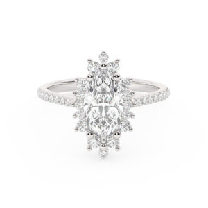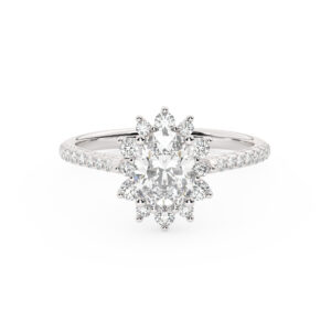 50% הנחהטבעת אירוסין היילו דגם 50024 זהב לבן 14 קראט במרכז זירקוניה 2 קראט בחיתוך אובל מסביב ובצדדים זירקונים בחיתוך עגול