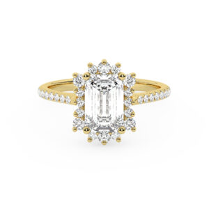 50% הנחהטבעת אירוסין היילו דגם 50024 זהב צהוב 14 קראט במרכז זירקוניה 2 קראט בחיתוך אמרלד מסביב ובצדדים זירקונים בחיתוך עגול