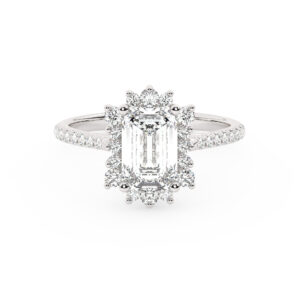 50% הנחהטבעת אירוסין היילו דגם 50024 זהב לבן 14 קראט במרכז זירקוניה 2 קראט בחיתוך אמרלד מסביב ובצדדים זירקונים בחיתוך עגול