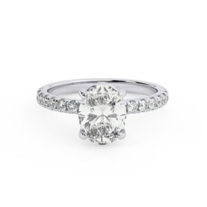 50% הנחהטבעת אירוסין סוליטר ויהלומים בצדדים דגם 50012 זהב לבן 14 קראט במרכז זירקוניה 2 קראט בחיתוך אובל מסביב ובצדדים זירקונים בחיתוך עגול