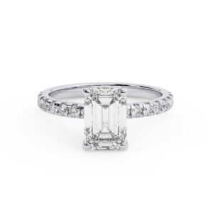 50% הנחהטבעת אירוסין סוליטר וזירקונים בצדדים דגם 50037 זהב לבן 14 קראט במרכז זירקוניה 2 קראט בחיתוך אמרלד מסביב ובצדדים זירקונים בחיתוך עגול