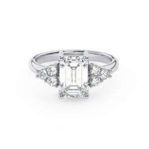 50% הנחהטבעת אירוסין סוליטר וזירקונים בצדדים דגם 50041 זהב לבן 14 קראט במרכז זירקוניה 3 קראט בחיתוך אמרלד מסביב ובצדדים זירקונים בחיתוך עגול