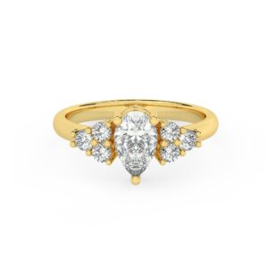 50% הנחהטבעת אירוסין סוליטר וזירקונים בצדדים דגם 50037 זהב צהוב 14 קראט במרכז זירקוניה 5 קראט בחיתוך טיפה מסביב ובצדדים זירקונים בחיתוך עגול