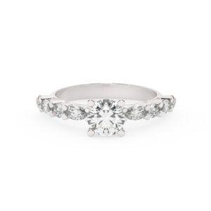 50% הנחהטבעת אירוסין סוליטר ויהלומים בצדדים דגם 50068 זהב לבן 14 קראט במרכז זירקוניה 1.50 קראט מרקיזה בחיתוך קראט מסביב ובצדדים זירקונים