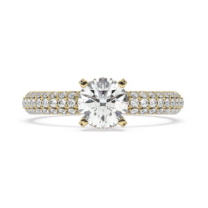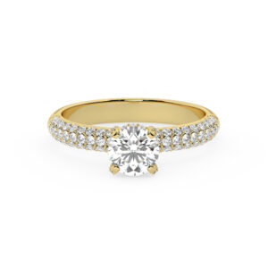 50% הנחהטבעת אירוסין סוליטר וזירקונים בצדדים דגם 50014 זהב צהוב 14 קראט במרכז זירקוניה 1 קראט בחיתוך עגול מסביב ובצדדים זירקונים בחיתוך עגול