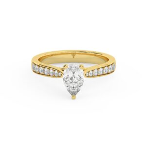 50% הנחהטבעת אירוסין סוליטר וזירקונים בצדדים דגם 50017 זהב צהוב 14 קראט במרכז זירקוניה 3 קראט בחיתוך טיפה מסביב ובצדדים זירקונים בחיתוך עגול
