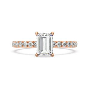 50% הנחהטבעת אירוסין סוליטר וזירקונים בצדדים דגם 50037 זהב אדום רוזגולד 14 קראט במרכז זירקוניה 0.50 קראט בחיתוך אמרלד מסביב ובצדדים זירקונים בחיתוך עגול
