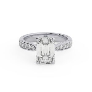 50% הנחהטבעת אירוסין סוליטר וזירקונים בצדדים דגם 50017 זהב לבן 14 קראט במרכז זירקוניה 3 קראט בחיתוך אמרלד מסביב ובצדדים זירקונים בחיתוך עגול