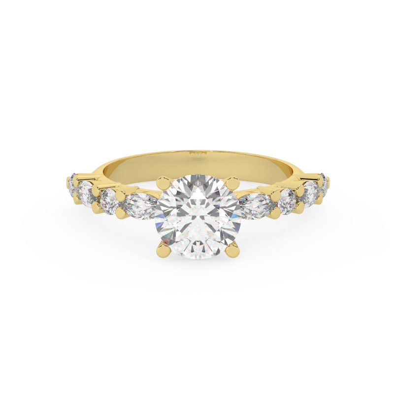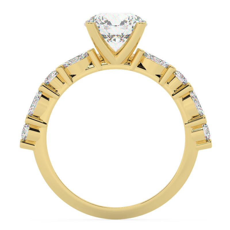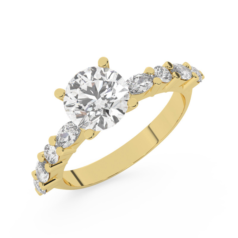 טבעת אירוסין סוליטר ויהלומים בצדדים דגם 50068 כסף מצופה זהב צהוב במרכז יהלום מעבדה 2.50 קראט בחיתוך עגול עם תעודה גמולוגית אירופאית IGI מסביב ובצדדים יהלומי מעבדה במשקל של 0.40 קראט בנוסף 0.20 קראט